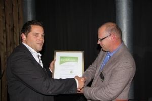 | Ronnie Kersten (links) ontvangt het RAG-certificaat van Rob Scholman. |